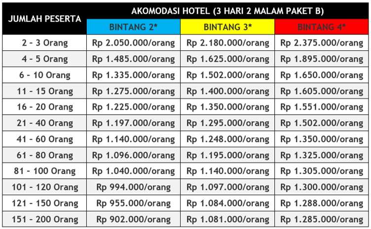 Harga untuk semua paket tour di atas adalah harga /orang dengan minimum peserta adalah 2 orang. Bayi umur kurang dari 3 tahun free, 3-5 tahun 50%, 6-7 tahun 75%, 8 tahun 100%